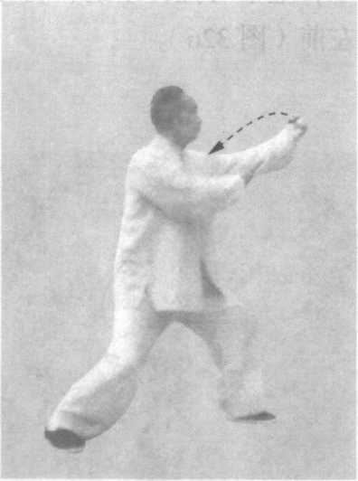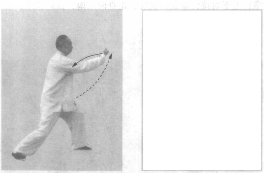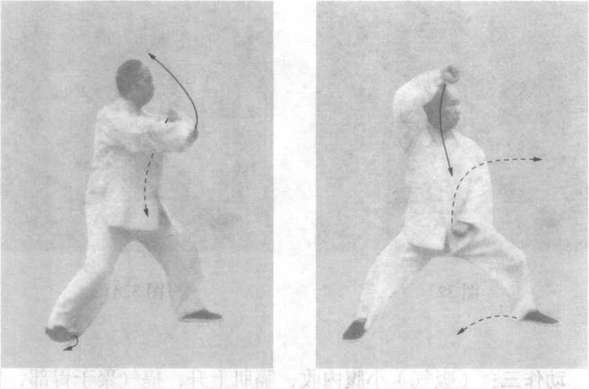 此式结合腹式逆呼吸的练法,作为举例。学者先须熟练动作 路线及其技击作用,然后结合腹式逆呼吸,以自然舒适、不胸 闷、憋气为原则。学太极拳以医疗保健为目的者,可以不结合腹 式逆呼吸。若旨在强壮身体,发挥技击作用,而不结合呼吸行 气,熟练推手,那就等于缘木求鱼,终无所得。
