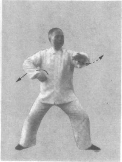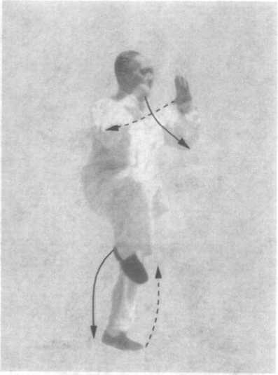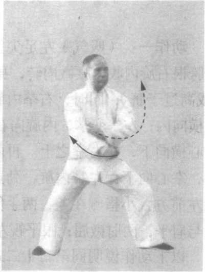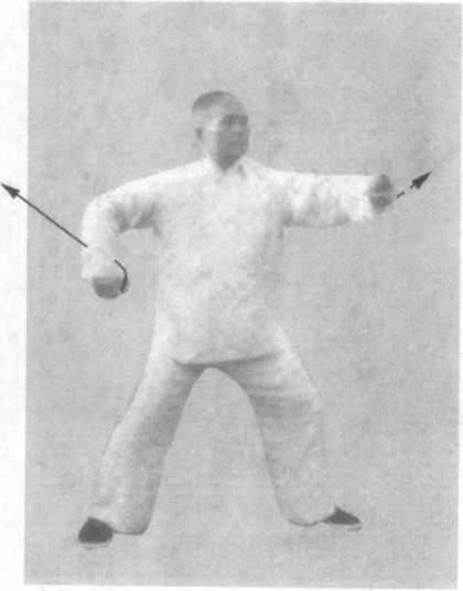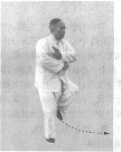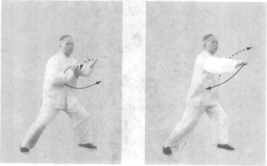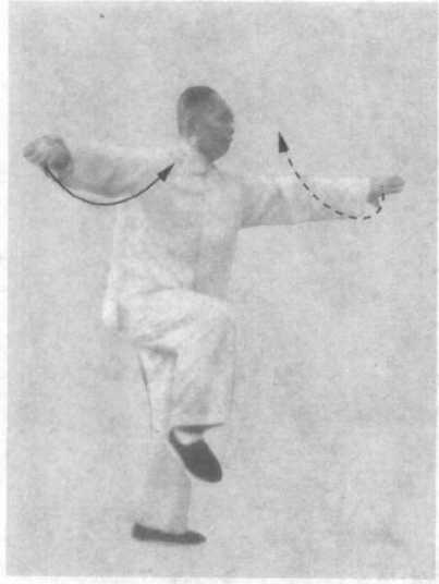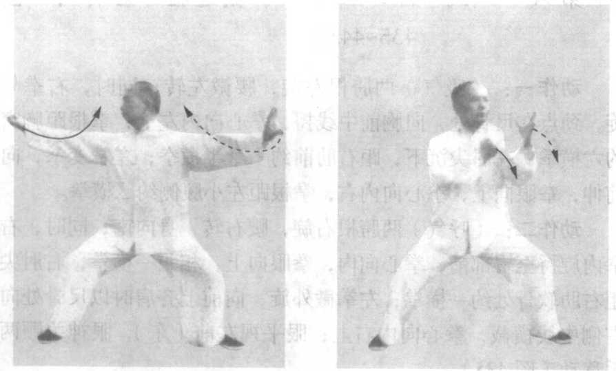 动作一:(吸气)左足尖里扣,对向右前约45。,左腿站稳, 两胯根右旋内收,腰微内转,身向右前约45。,右膝仍提起与脐平 (或高过于脐);同时,右拳内旋向上、向中线划弧至胸窝前,拳 心横向内;左拳变掌,内旋向右、向中线经鼻前而下,至胸窝前, 掌心横向下,在右拳之上。再两手交叉而过,右拳内旋向右侧伸 展,拳心向下;左掌内旋,劲点在掌缘,向左侧捌去,左掌心横 向左前方,小指侧在上,两手似撕丝棉,到落点时用意贯劲,两 手与肩平,两肘微屈;眼平视左前(图425)。同图155。