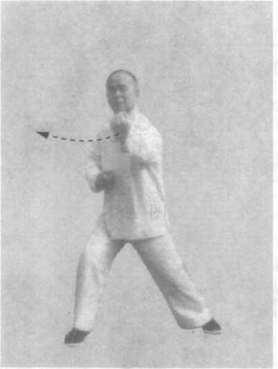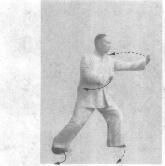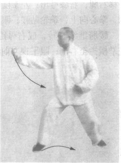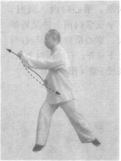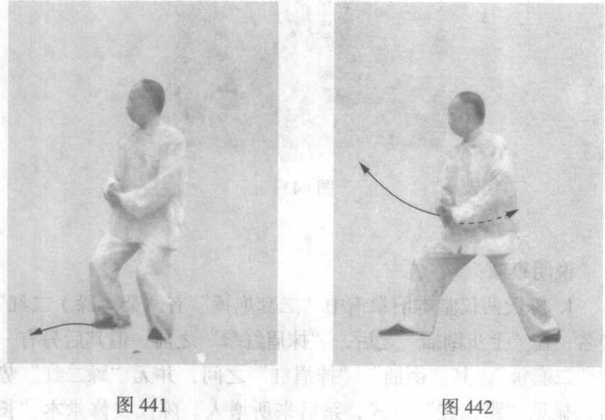 1 .图435738练习左旋右转,截前顾后的横劲,并使用钩拳, 腰腿变转须柔活,两手缠绕须圆转柔顺,发劲的一刹那要刚脆。