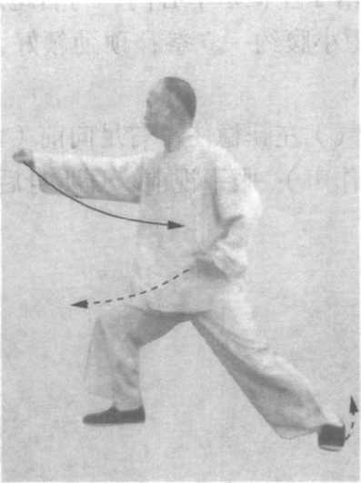 动作八:(呼气)右足前弓,落胯塌腰,两胯根右旋前送, 腰微左转,左足用劲蹬地,成右弓蹬步,身向南;同时,右拳内 旋,向前上尽力击出(或到落点时用意贯劲,不发劲),手与肩 平;左掌变拳,左肘尖向后击,左拳靠近左腰软处,拳心向上; 两足用劲蹬地,腰一拧,与右拳发劲、左肘后击,须同时完成,
