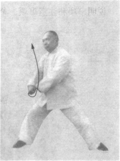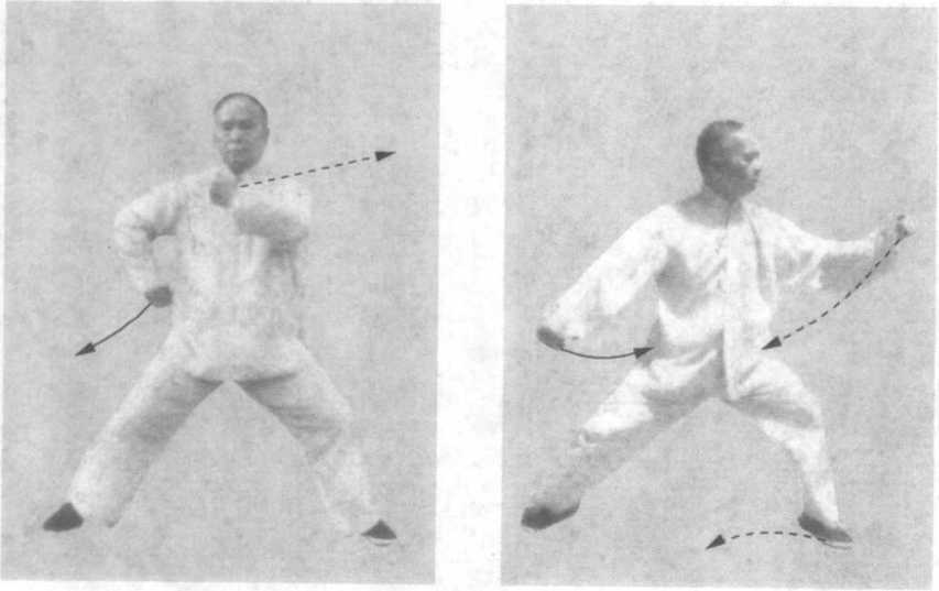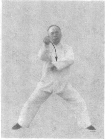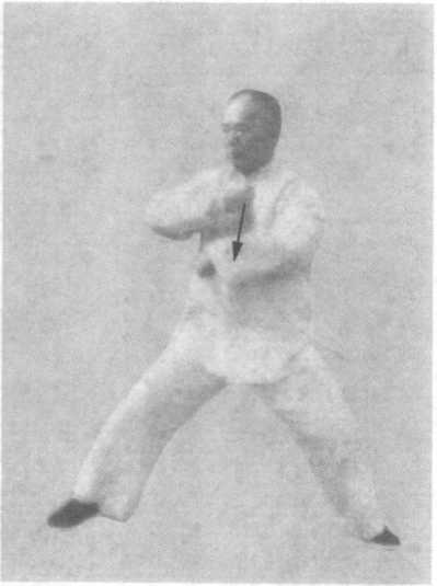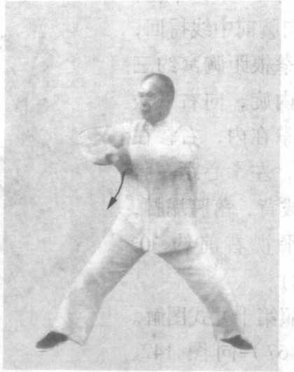 沉,左拳微外旋,前臂含搠劲, 往左引进,拳心向内上,拇指齐 胸窝相距约二横拳;右拳外旋, 劲点在尺骨处,向胸前中线捋回, 拳心向左内上,拳根距胸窝约三 横拳;两拳转为内旋,向右下松 沉至右胯前,左拳在内,右拳在 外,拳心俱向内,左拳心距右胯 约一立拳;含胸拔背,落胯塌腰, 吸气蓄势;眼平视右前约30° (图465)同图141o