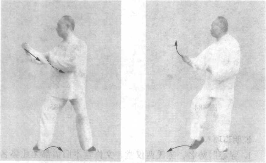 两拳旋转捋回,要柔顺,柔中寓刚,要周身团聚,以裹紧为 蓄势。右足上步和左足跟步,可以先后震脚,使两拳前后对拉的 爆发力更强。也可练成“意动形随” “意到劲到”,不震脚,不刚 发。前者为明劲,后者为暗劲。