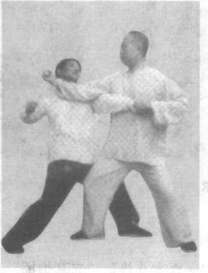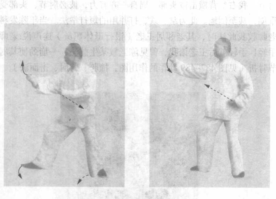 我左手采拿彼左手,我左手外旋里缠;我右拳外旋里缠以尺 骨黏捋彼前臂近肘节处,使彼感痛前倾近我身。我进右足踩彼脚 面,左足跟半步,我左手急采彼左手至腰侧,我右肋前侧挺击彼 肘节,我右拳背横击彼头部,周身一齐着力,彼必肘节、头部受 重创,甚至倒地。此为拿、跌、打并用的短打拳法。当年陈发科 老师教我此法时,其老邻居王老(银行退休职员)连声说:老师 手轻!手轻。后王老语我,曾见陈老教某生此法,一崩劲使其肘 节骨折(见图487?489动作的作用图,撞胯、背肘、击面法)。