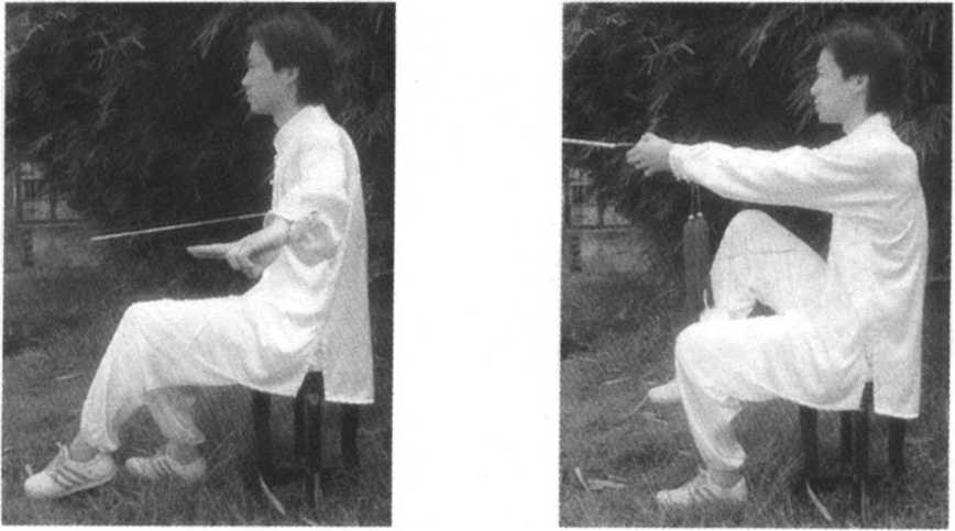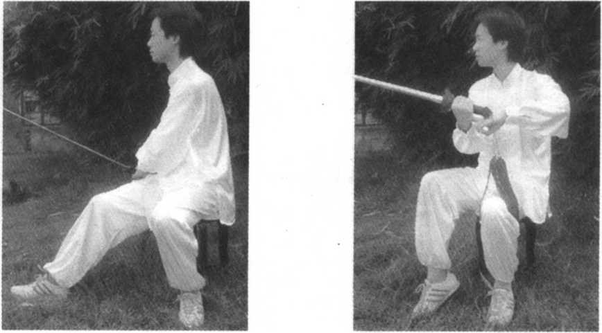1. 心脚后退一步,左脚也微向后撤,脚尖着地;H时 两手平行分幵,手心都向下,剑身斜置于身体右侧,剑 尖位于体前,左剑指置于身体左侧(图26)。