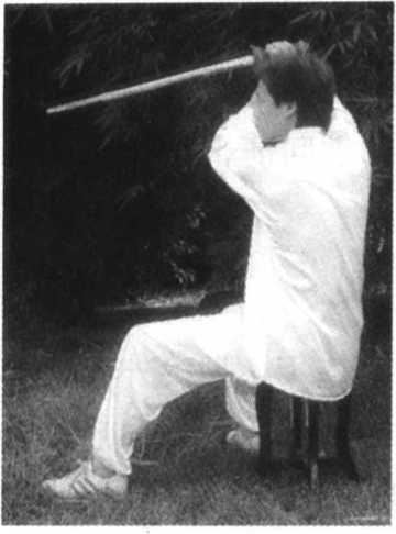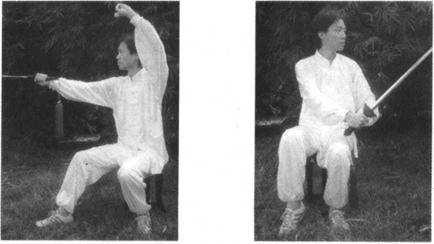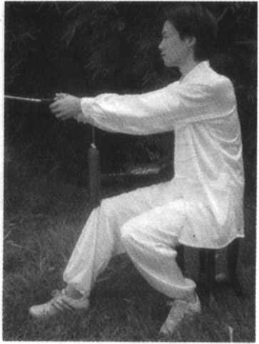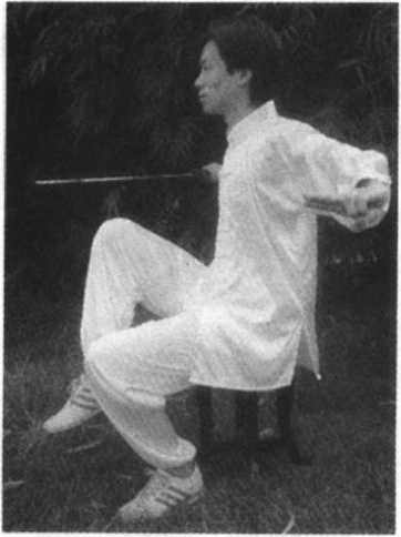 1. 右脚原地落下,左脚原地屈膝提起,同时两手捧 剑先微向回收,紧接随右脚落地再向前伸刺(图28)。