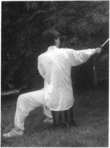 3. 右脚稍向前落下成右弓步;同时右手剑向前平刺(