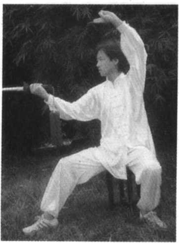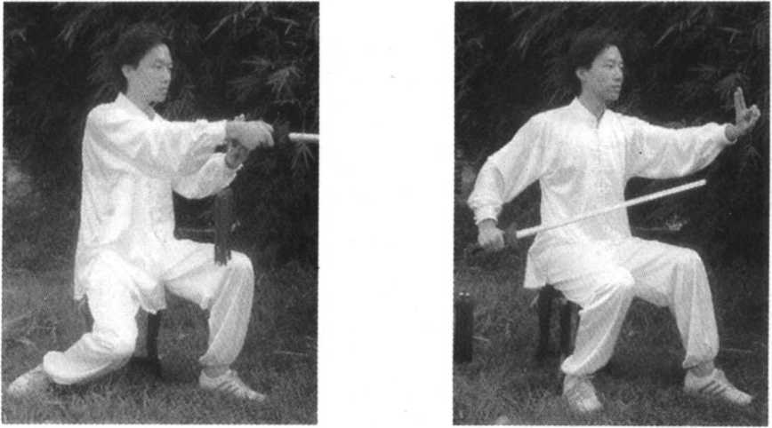 要点:右脚后退,左脚上前,右手剑由前向后划圆, 动作要协调一致。