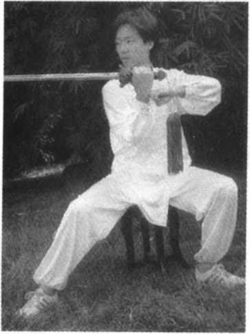 1. 身体左转,重心后移,右脚尖里扣,左脚尖外展, 成侧弓步;同时,右手将剑柄收引到胸前,剑身平直。 剑尖向右后,左〒剑指仍附于右腕上(图35)。
