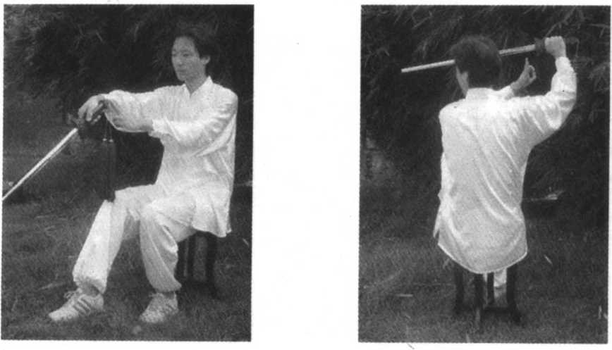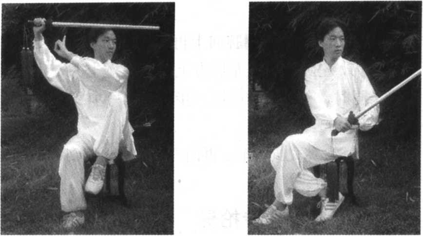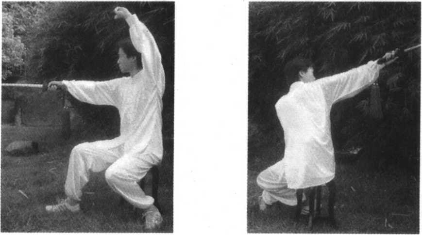 要点:身体右转时,右脚先后撤,左膝随即屈膝提 起成独立式。身体右转,右脚后撤,右手剑随右转向右