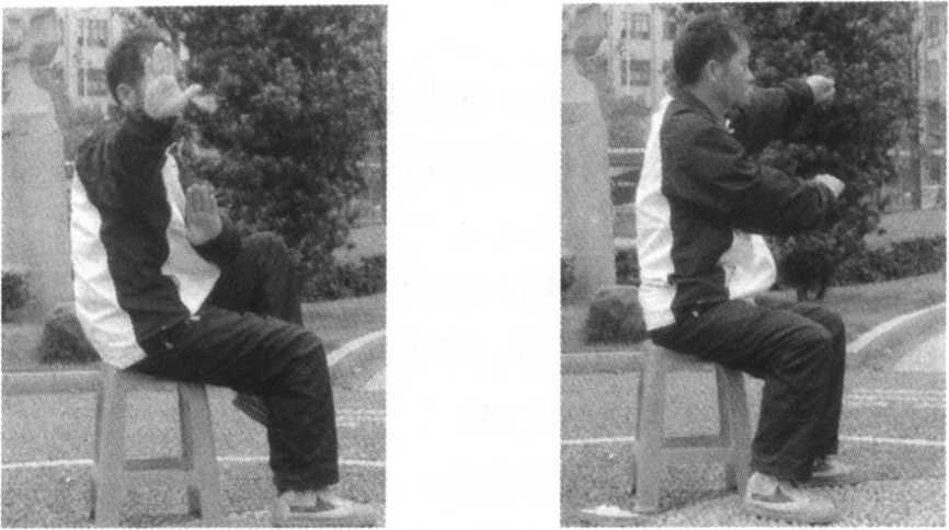 5. 重心后移,左脚尖内扣,上体右转;同时两拳变 掌,左掌收于胸前,掌心斜向上,右掌掌心斜向下,从 左前臂上方穿出,眼平视前方(图76)。