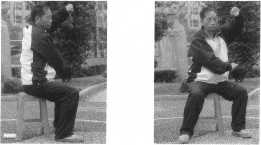 4. 上式不停,左拳向右屈肘平贯,停于右额前,拳 心斜向外,右拳向左平贯,停于左肋前,拳心向下,眼 转看右前方(正东)(图75)。