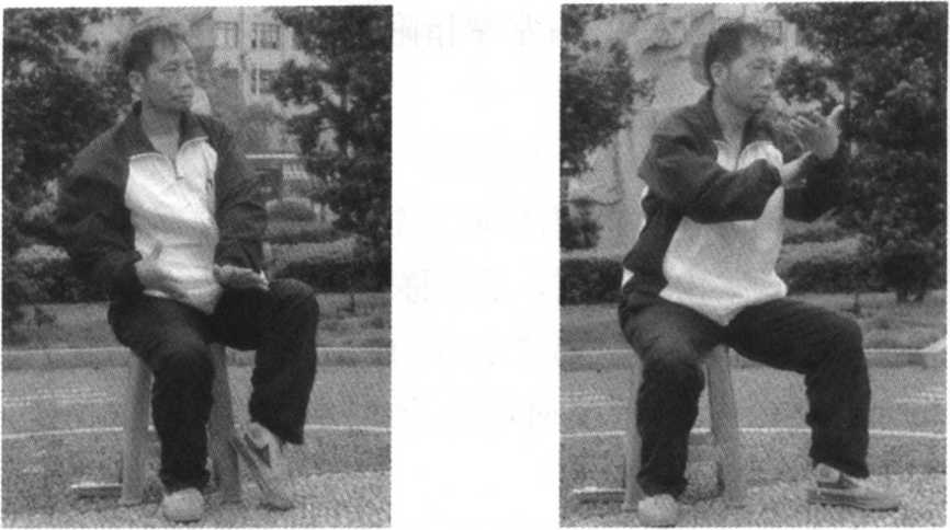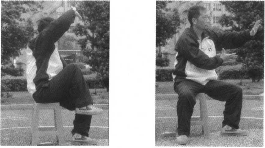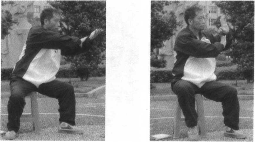 1. 右脚后撤半步,同时右掌向前向下落,掌心转向 上,左掌自右前臂上方向上向前伸,掌心向下,眼看左 掌(图93)。2. 重心后移,两掌自体前向下向后一齐捋回,收至 腹前,头随体转(图94)。3. 左掌经腹前翻转上举,高与胸平,掌心向内,右 掌同时翻转上举,掌心向前,掌指附于左腕内侧(图95)。4. 135第四章彭氏坐势四十八式太极拳图94 图95重心前移,上体左转,左掌自右向前划平圆,高135第四章彭氏坐势四十八式太极拳图94 图95与肩平,掌心斜向内,右掌掌指附于左腕内侧随之划圆, 眼随左掌(图96)。