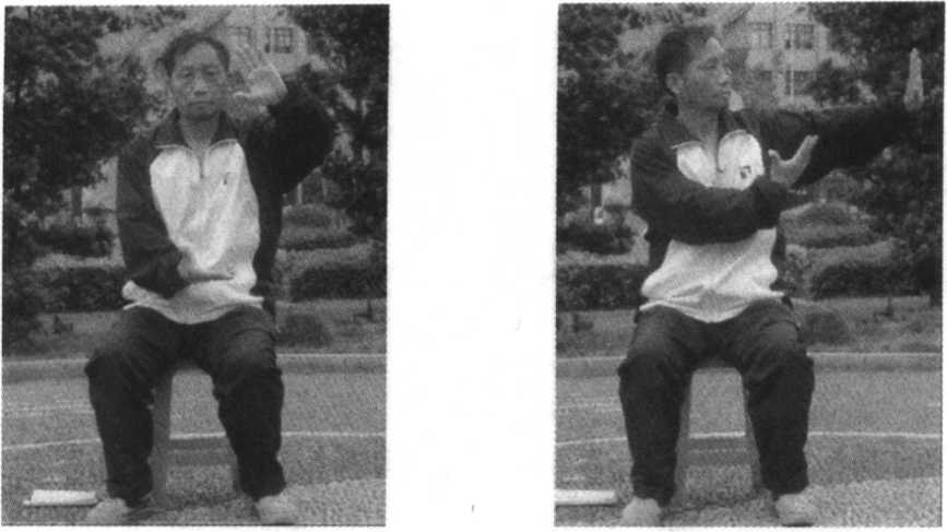 2. 右掌经面前向右继续划立圆,掌心向内,上体右转, 右手划至身体右侧,前臂内旋,掌心转向外,左掌向下经 腹前划立圆;同时左前臂外旋,掌心由外逐渐转向内,向'