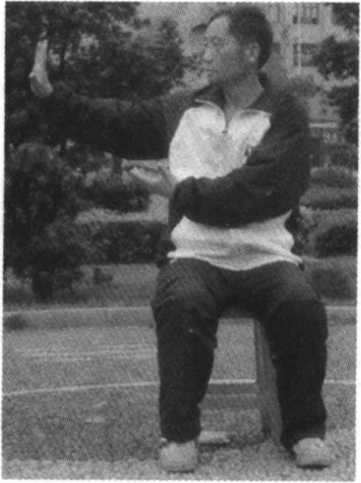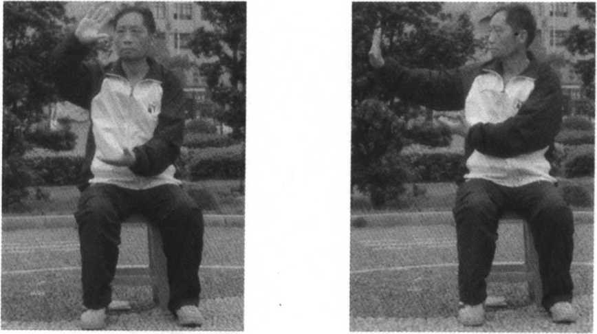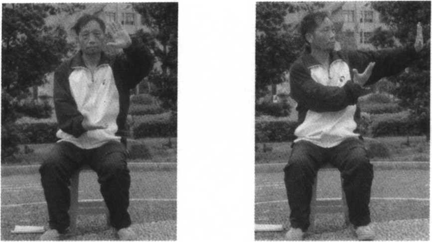 图102a 图102b掌向下向左划立圆至左肩前,掌心向内,左勾手变掌。目艮