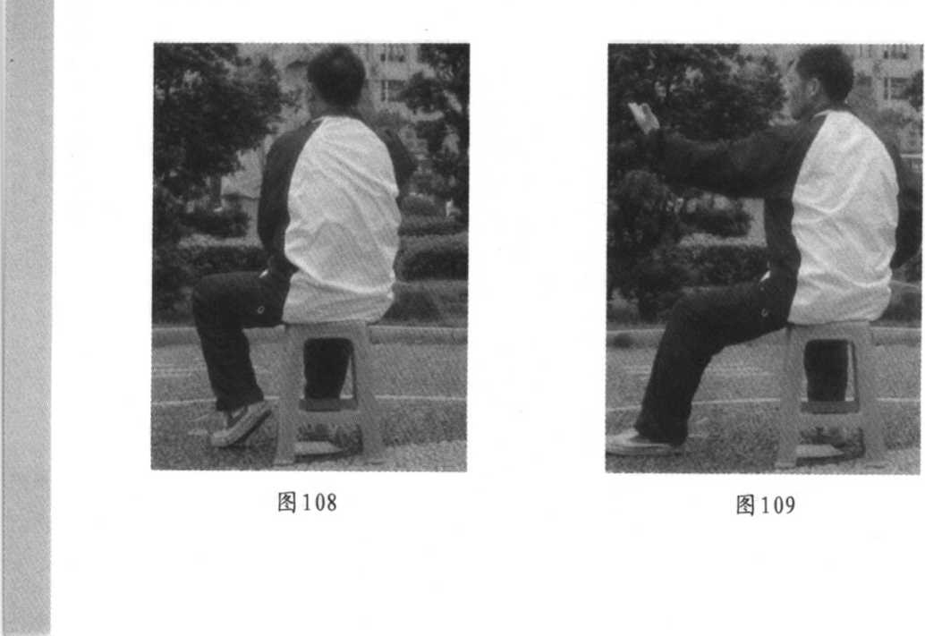 3. 上体继续右转,左脚提起靠拢右脚落地踏实,随 即右脚提起向右后转半步踏实,左脚随即收于右脚内 侧,脚尖点地;同时右臂内旋使掌心向下,左臂外旋, 掌心向上,两掌右上左下在胸前成抱球状,眼看右掌(图 108)。