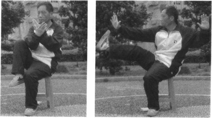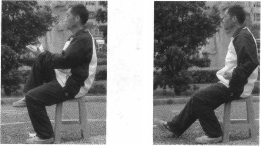 右小腿收回,右膝平屈,脚尖自然下垂?,左前臂外 旋,左掌由后向上向前划弧下落,右掌掌心翻转向上与 左掌同时平行落于右膝上方,眼向前平视(图117)。