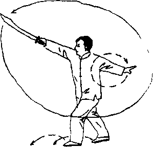 重心前移,两腿屈膝前顶 成双弓步,体左转。同时右手 持刀臂外旋,手心朝上,向上、向前劈刀,刀刃朝下,刀尖朝 前左手向下、向后弧形摆 动,掌指朝后,手心朝下。目 视刀。(图564)要点:两膝前顶、转腰顺 肩劈刀要协调一致。 图564图565荽点:劈刀要走立圆,插步要迅速,步法要稳定。