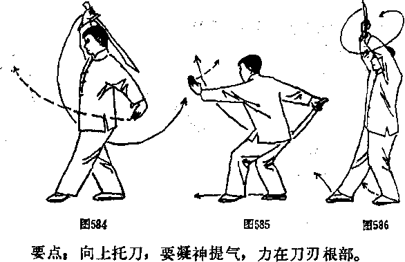 左脚蹬地,身体上起,:丰脚前出一步,前脚掌着地,右 手持刀臂外旋,刀尖朝后,自后向前、向;托击于头前上 方,刀刃朝上,刀尖朝右左手屈臂附于右小臂内侧。目视 湔方。(图586)