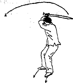 右脚蹬地) 左腿屈膝前摆 落地,右脚落在左脚前。身体 腾空时,右手持刀屈臂在头顶 上方云刀,刀刃朝上,刀尖朝 后;左手贴于右小臂处。目视 前方。(图587)要点:云刀时要以腰带臂, 以腕制刀,蹬地摆腿要迅速。 (29)跟步劈刀右脚前跨一步,左脚上跟半步。右手持刀向上、向前劈刀,刀刃朝下,刀尖朝前;左 手随劈刀贴于右手腕内侧。目视刀尖。(图588)乂荽点:跨歩、跟步荽连贯迅速。 ,