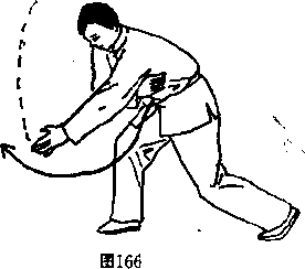 ② 田挪左手贴胯直臂向右挑至体前。同时,右手向左腋下插 掌,掌心朝里,成两臂交叉。目视左方。(图166)