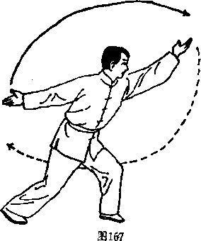 ③ 左手直臂向上向左抡 转,右手向下向右划孤。同时, 以两脚掌为轴向左转体。目视 左方。(图167)