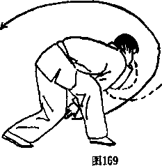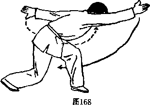 ④ 上体左转并前压,右肩 前探,带动右手直臂向上向前 松转,至前上方,虎口朝上, 左手直臂向下向后抡转,至后 下方,虎口朝下,两臂呈斜 平。目视前方。(图168)