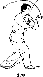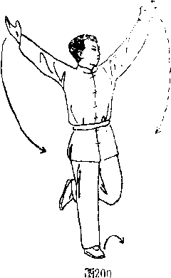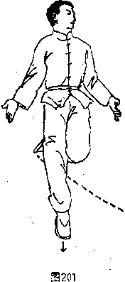 ① 上动稍停,右脚上步,脚尖外展,同时,两臂稍屈 时,左掌在下向右,右掌在上向左,呈十字交叉,手心均朝 上。目视前方。 (图199)② 上体重心前移,右脚活步,左脚抬起于右腿后,同: 时,两手向上向两侧分开。(图200)③ 右脚立即前跳,身体腾空时,两手直臂向下劈掌于两惻,力点在手臂小指侧。目视 左方。(图201)要点:上步与交叉手一 致,活右步与跳步要快速连贯, 两臂下劈时要沉肩、直臂、有 力。