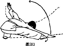 上、向前抡转拍地于 右脚前;左手协同向 后,至斜上拳,虎口 朝后,手心朝上。目 视右手。(图203) 要点:上右步 时,身体要左转与上 体下压快速一致,上体下压以助拍地(压打)之力。拍掌时' 要沉肩、肘尖朝下、掌心着力。