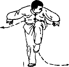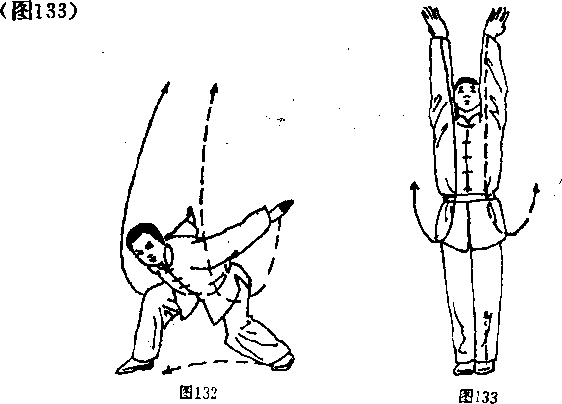 ①两腿瞪地半蹲起,上体仍前術,两手臂直臂向后至身 后两侧,手心相对,目视左前下方。(图132)①动作不停,左脚向右并步,身体直起,同时带动两毛 经胯侧向前,向上托起至头上方,手心朝后。目视两手方向)荽点:并步要快,上托要有力,力达掌根,托起时,身 体向上顶劲,两腿充分伸直。(17) 双掸手上动稍停,屈右腿,提左 膝,同时两臂屈肘下落经胯侧 向后掸手,至身后两侧,手心 朝下。目视左方。(图34)要点:动作时要突然含胸 收腹、放臂,身体要合紧,掸 手要有力,力达手背,芊经胯时掸腿要击出响声。