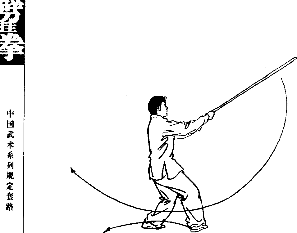 ①身体右转,重心移至右腿,左脚跟步成双弓步;同时右手 持棍,贴肋向右上方提拉。目视棍梢(图5-12)。
