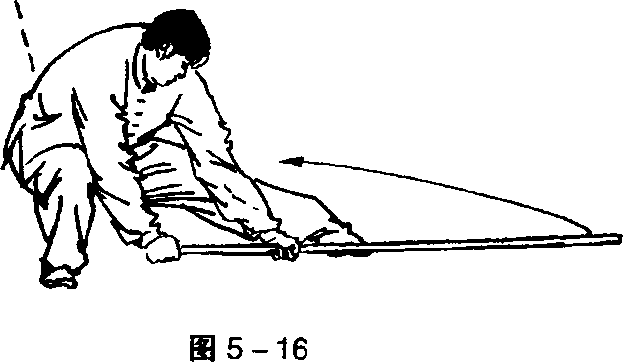 ④重心后移,右腿全蹲成仆步;同时两手持棍,向下猛力摔 棍。目视棍梢(图5- 16) o