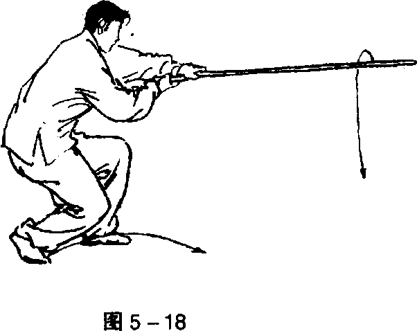 ①右腿屈膝站立. 左腿收提于右腿内侧; 同时,左手松握棍,右 手向后、向上提拉,棍贴 地体左恻。平视前方(图 5-17)o
