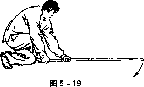 右脚向前上步成歇步;同时两手用力下压,将棍平扑(闷)于 地上。目视前方(图5-19)。