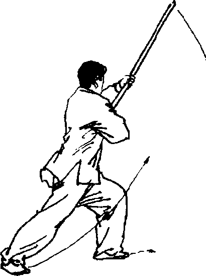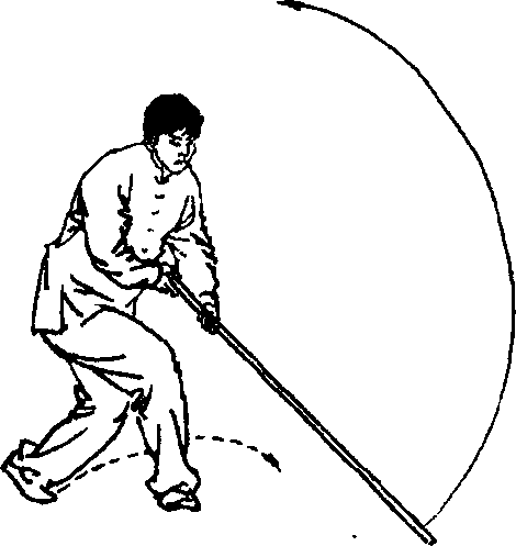 ①两腿弯曲站立,上体稍右转;同时棍梢右摆Q目视棍梢(图