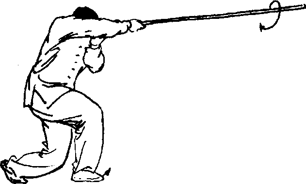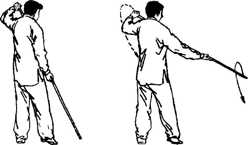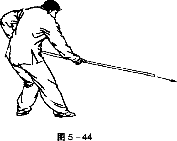 ②右手外 旋,用力上托;左 手屈腕,稍向下 拉;上体稍后仰, 使棍贴胸。目视 棍梢(图5- 43)。