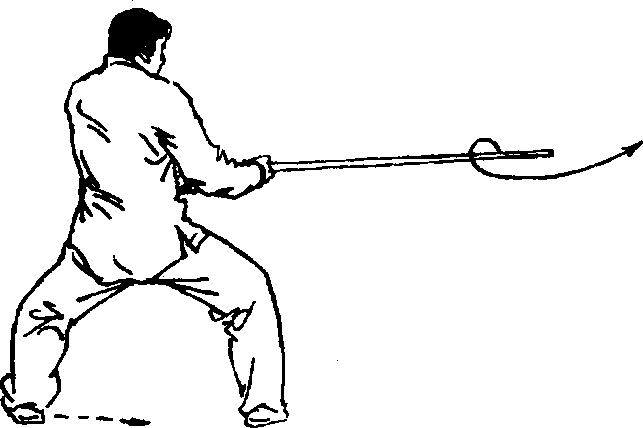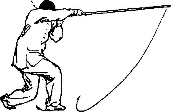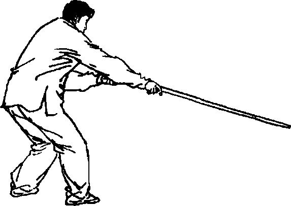 身体向左拧转成马步;同时带动两手向胸前旋推,使棍端划 弧向前平砍,力达棍前端。目视棍梢(图5-40)。