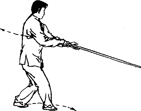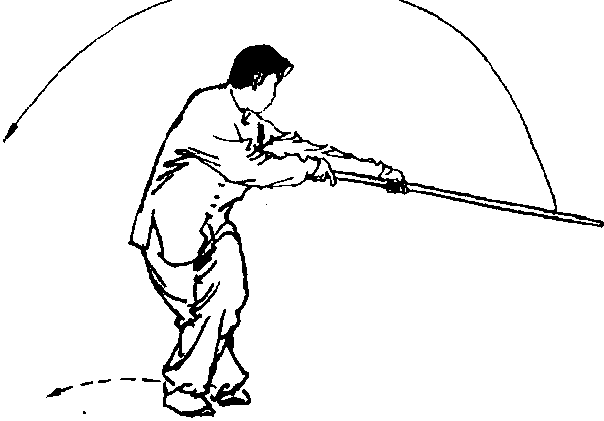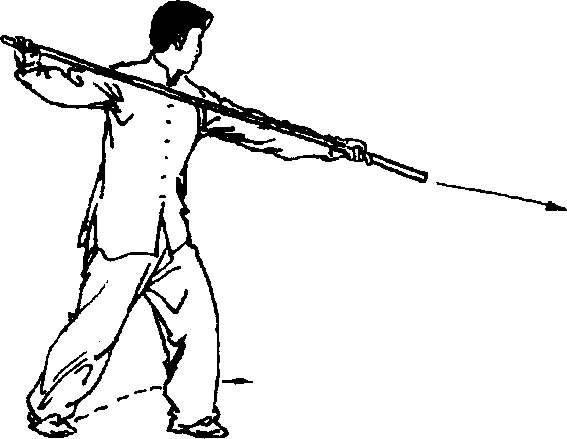 ①右手握至把 端,左手前伸换把; 随即左脚上步,右手 回拉。目视棍梢(图 5-46、图5-47]