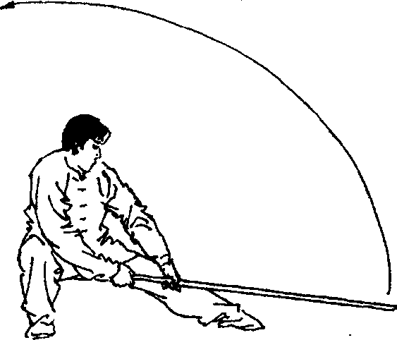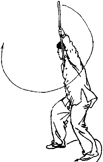 左脚后方插步;同时左手持棍,沿体侧逆时针方向划弧挑棍。目