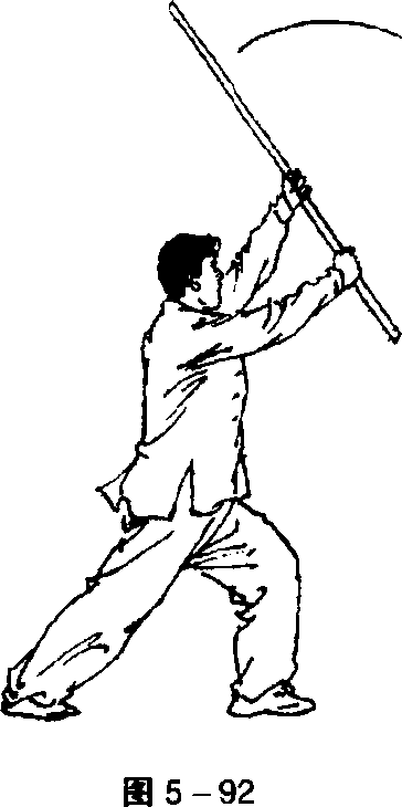 ②上动不停。身体右转, 左脚向右扣步;同时左手滑 把,在体侧沿顺时针方向划弧 挂棍后,两手持棍上举°目视前 方(图 5-91、图 5-92)。