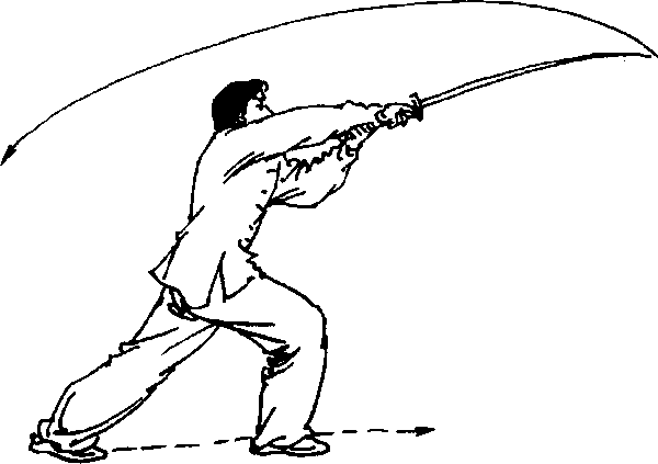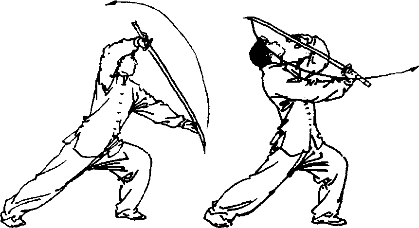 ①身体微左转,再向右转,左脚向左前方上步;同时两手持 刀,向上、向右、向后拉刀于身体右侧,刀刃朝下,刀尖朝后。目视