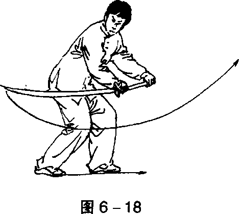 ②左手向右、向前推拨刀背,右手持刀,以刀刃领先向下、向 右、向上拉刀;上体含胸,随之后移(图6 -23)。