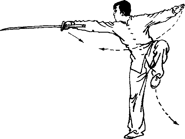 图 6-89④上体向左转体90°,右脚跟着地,随即左腿提膝;同时左手 离开刀背,向左后方平伸,掌心朝下,右手持刀,向前用力平刺, 刀刃朝右o目视刀尖方向(图6 -89)。