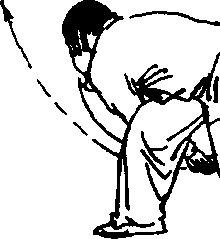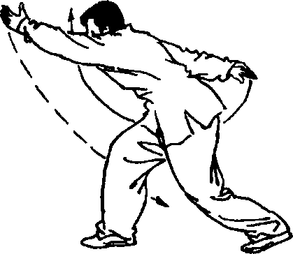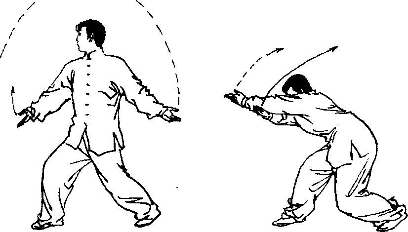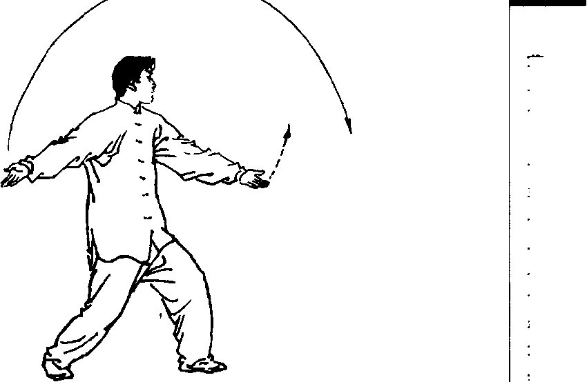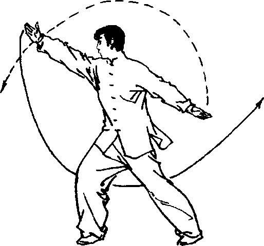 图 2- 77回挂,屈肘收至右 耳侧;右掌直臂继 续下挂至左大腿 外侧,两掌心均向 外。目视前下方 (图2-76)。上动 不停(或稍停)。以 两脚为轴,身体向 右翻转,同时,带 动右臂向上、向右