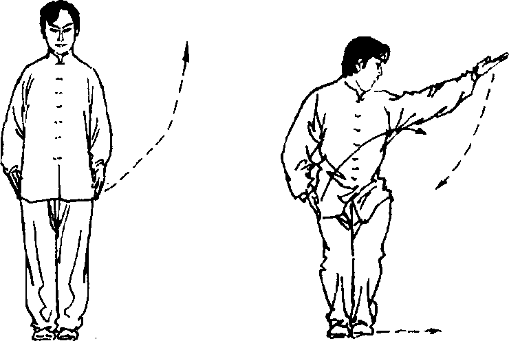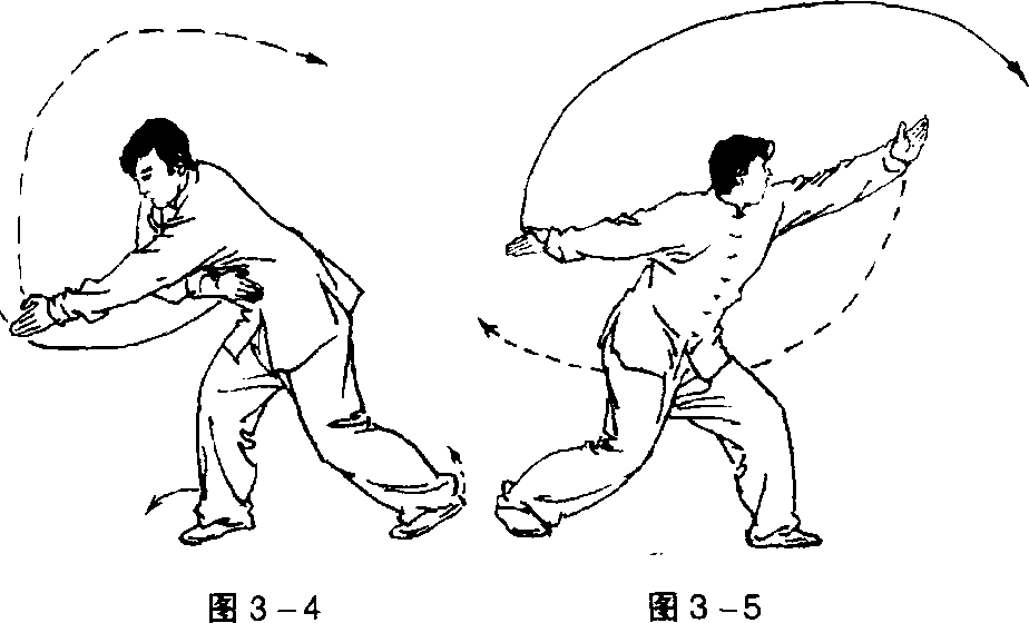 第一段1 .预备势①并步直立;两臂垂于体侧,掌心向里,中指贴于裤缝。目视 前方(图3-1)。②稍定,屈膝半蹲;同时,左掌向左抬起,掌心朝上,肘下垂, 掌与眼同高;右掌稍向上提肘。目视左掌方向(图3-2)。要点:①稍含胸收腹、顶头,精神集中,两眼要有神,站立停稳。②动作要稍慢并与转头一致,顶头沉肩。图3-3图3-3