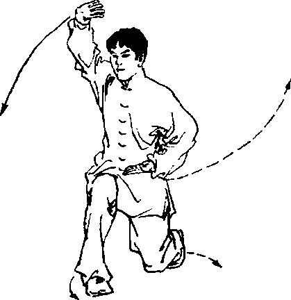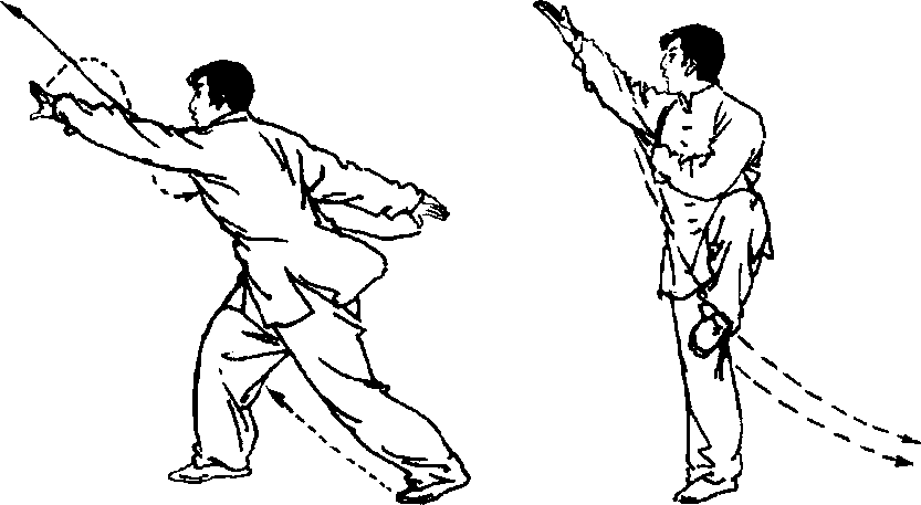 前挑时要身抬手起,转腰带臂,臂走立圆。抡转时须以腰带 臂,合膝转足,臂要伸直走立圆。穿掌要快速有力,尽力远伸,右 腿立直要稳。整个动作要上下一致。