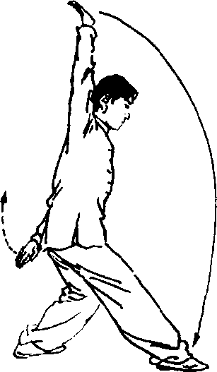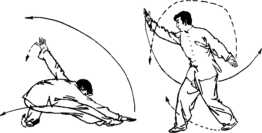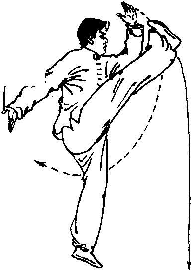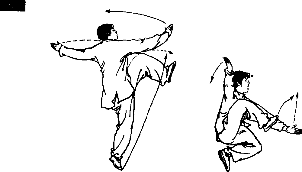 ⑥右脚迅速向前上蹬出,脚尖勾起;同时,右掌继续向后摆; 左掌向前与右脚内侧相碰(手掌擦脚内侧)。目视右脚(图3- 145) o