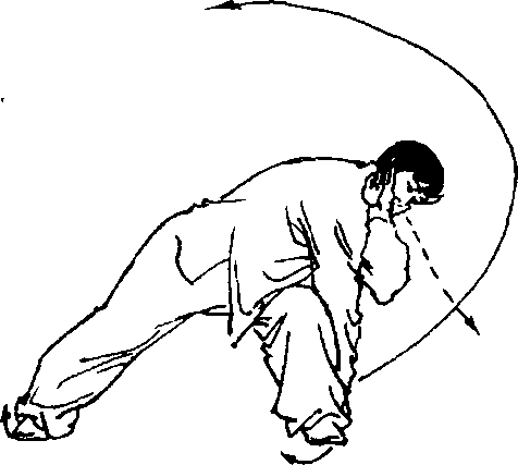 成双弓步时要收腹含胸,左肩内扣,向左抡转时,要合膝钻 足,拧腰切胯,两臂成立圆,手尽力前伸。