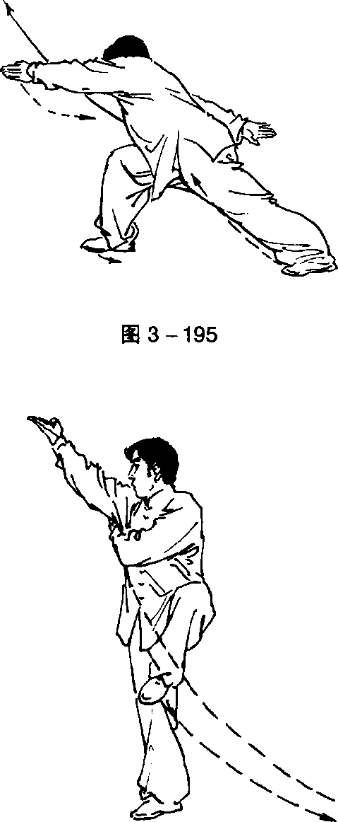①两脚以脚掌为轴,同时向右拧转成右弓步;右臂内旋,右 掌经前向上、向右劈出,掌指朝前,掌心向右;左掌向后打开,拇 指朝下,掌指朝后。目视右下方(3-195)。