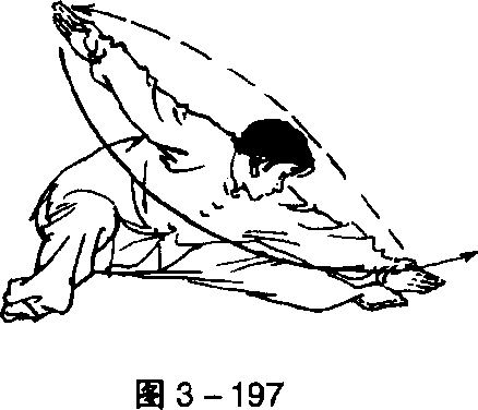 侧(手背擦腿)向前穿掌至左脚面上,虎口朝上;右臂稍内旋至虎 口朝上。目视左掌方向(图3-197)。