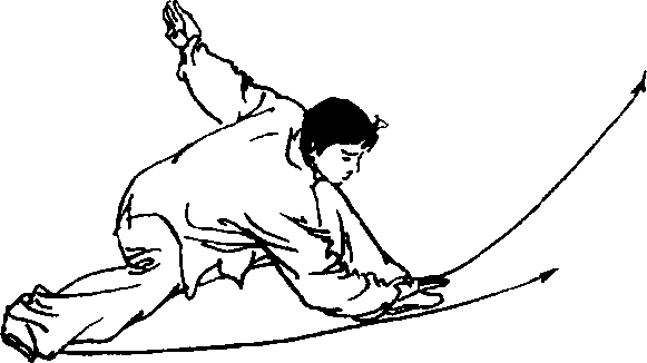右腿全蹲,左腿向左 前下落地,成左仆步;同时, 左掌贴腹向下,沿左腿内